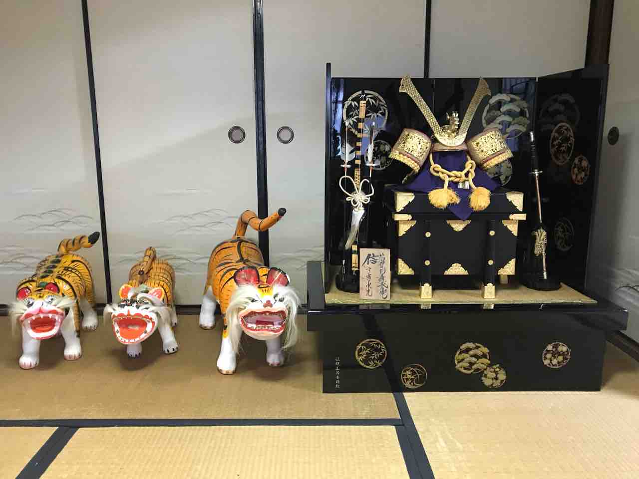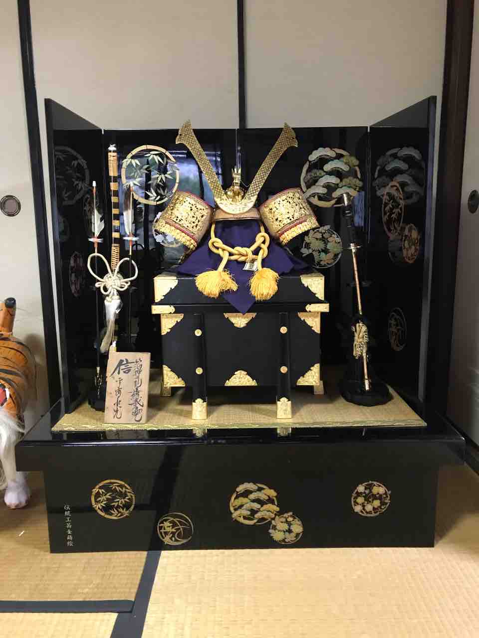 台を組み立て黒い屛風を立て、兜と刀と弓を飾ればOKだ。