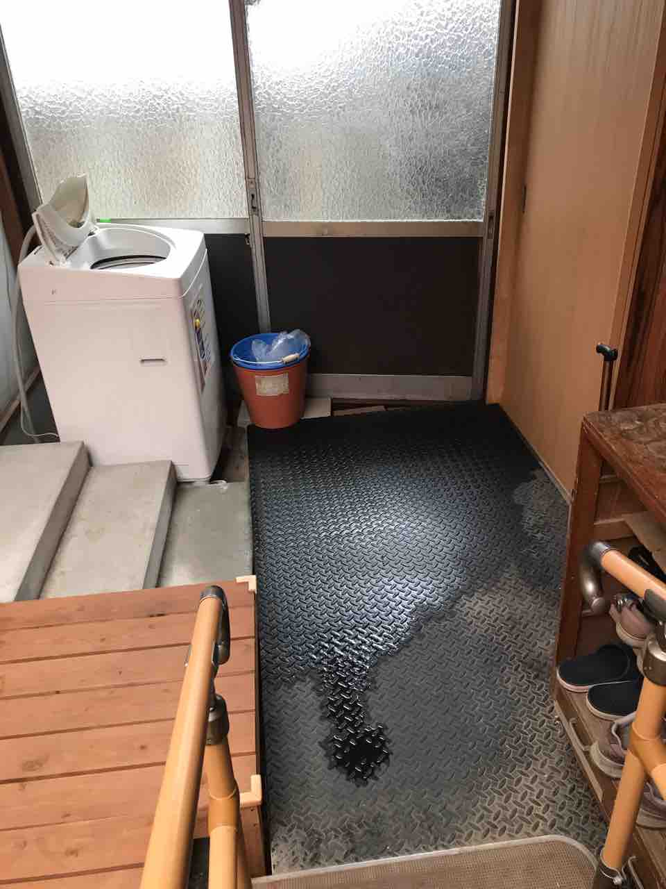 そして雨漏りの下は土間なんだけど、コンクリートブロックを敷いてかさ上げし、その上にマットを敷いているのでどうすることも出来ない。