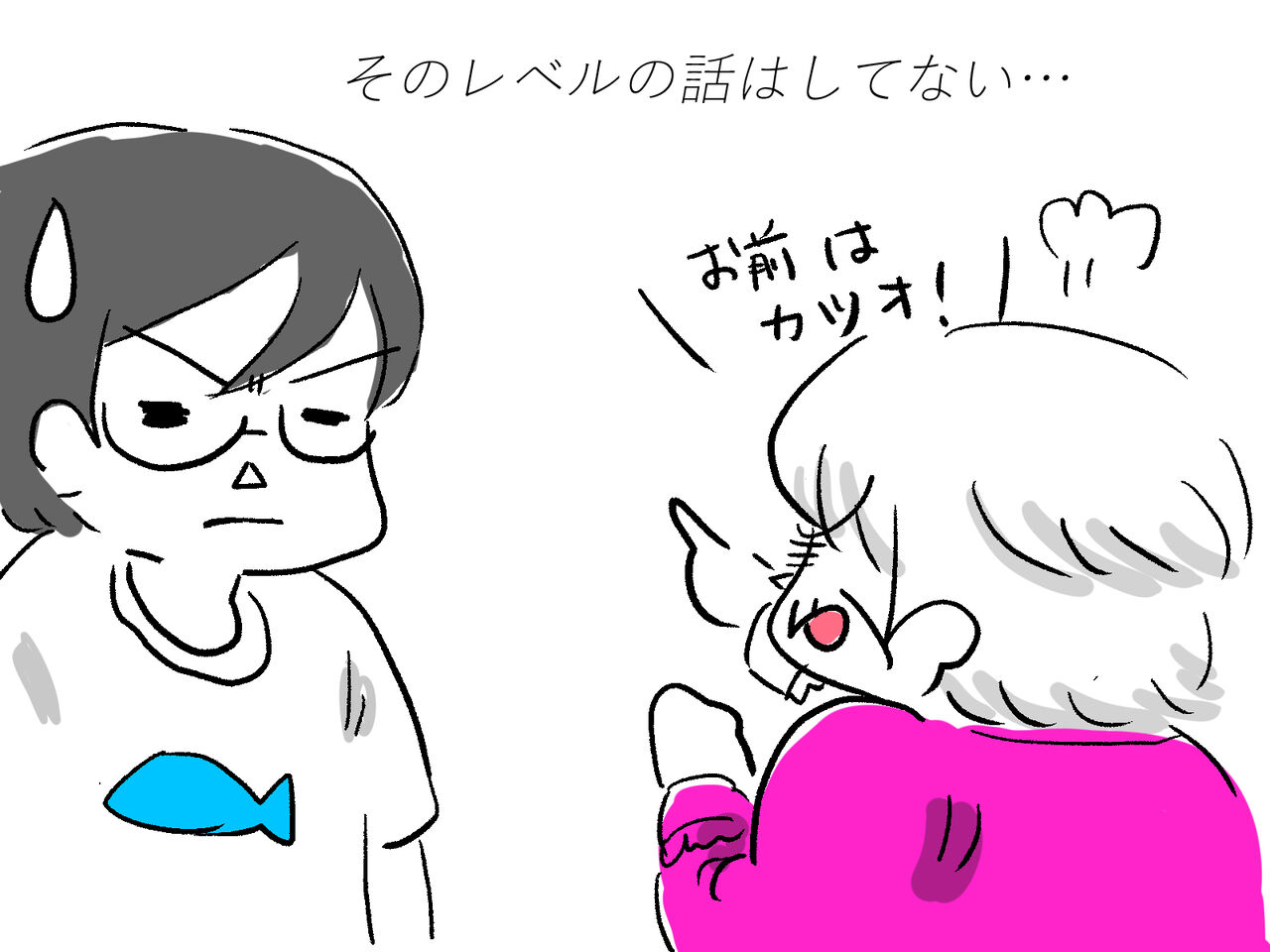 か「さっきはビックリしたわ~。「お前はかつおや!」って言われた時、一瞬意味が分からんで、ボケはお前やって意味かと思うたんや。けどよっちゃん見ながら「こっちは好子さんや!」って言うたからそうでないって分かったんや」