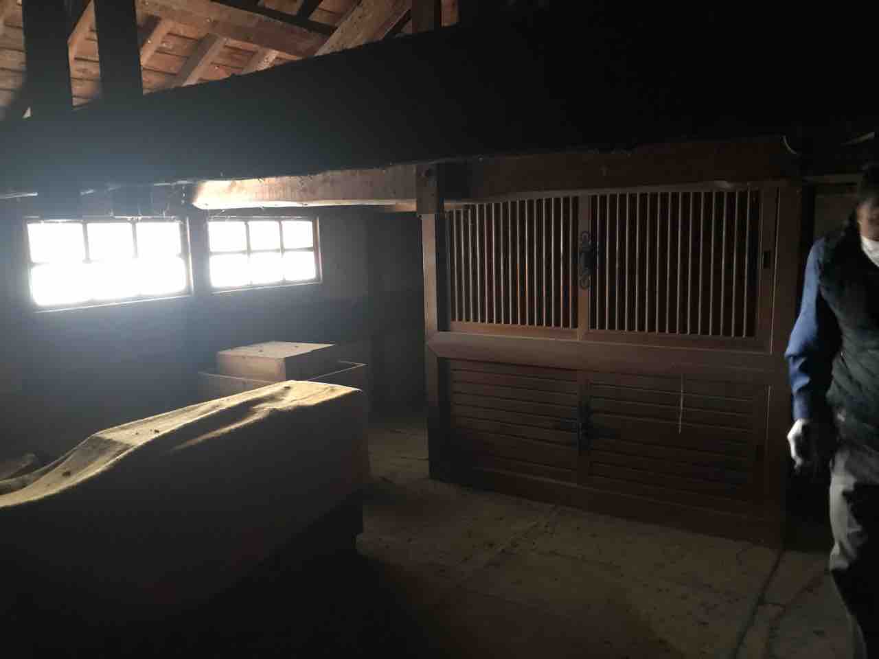 それにしても埃だらけで汚いが立派な柱や梁、合掌造りの骨組み、それから昔の棟上げの時の物だと思われるお札や扇子に圧倒された。
